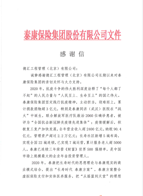 致德汇公司的一封感谢信! ------泰康保险集团股份有限公司