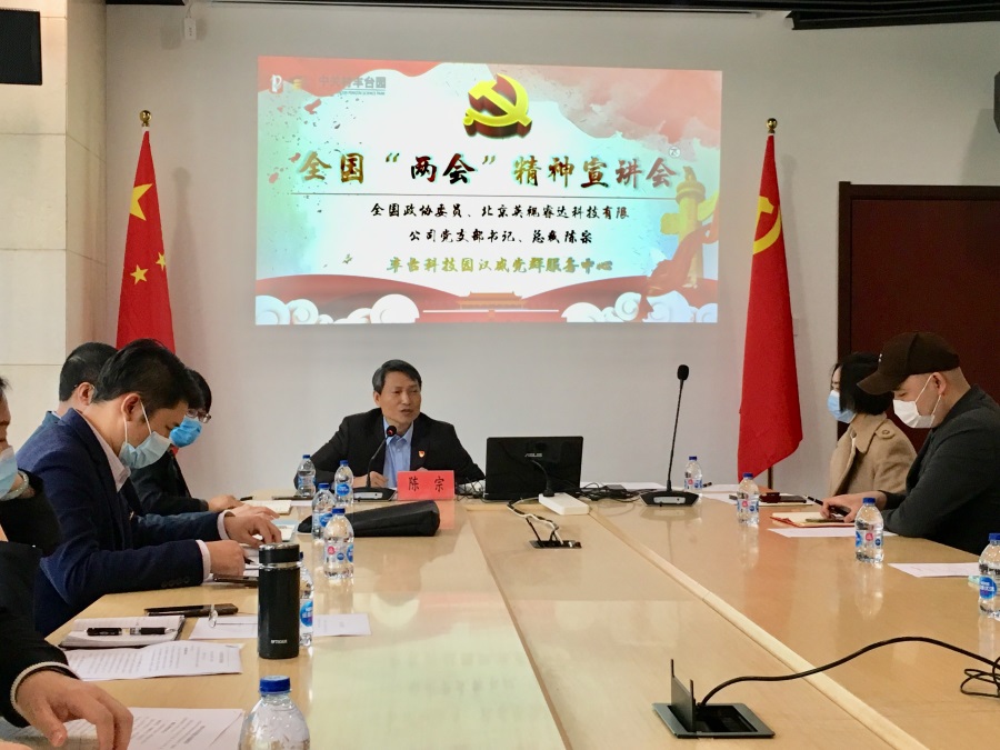 首先,邀请了全国政协委员、北京英视睿达科技有限公司党支部书记、总裁陈宗宣讲了全国“两会”精神;