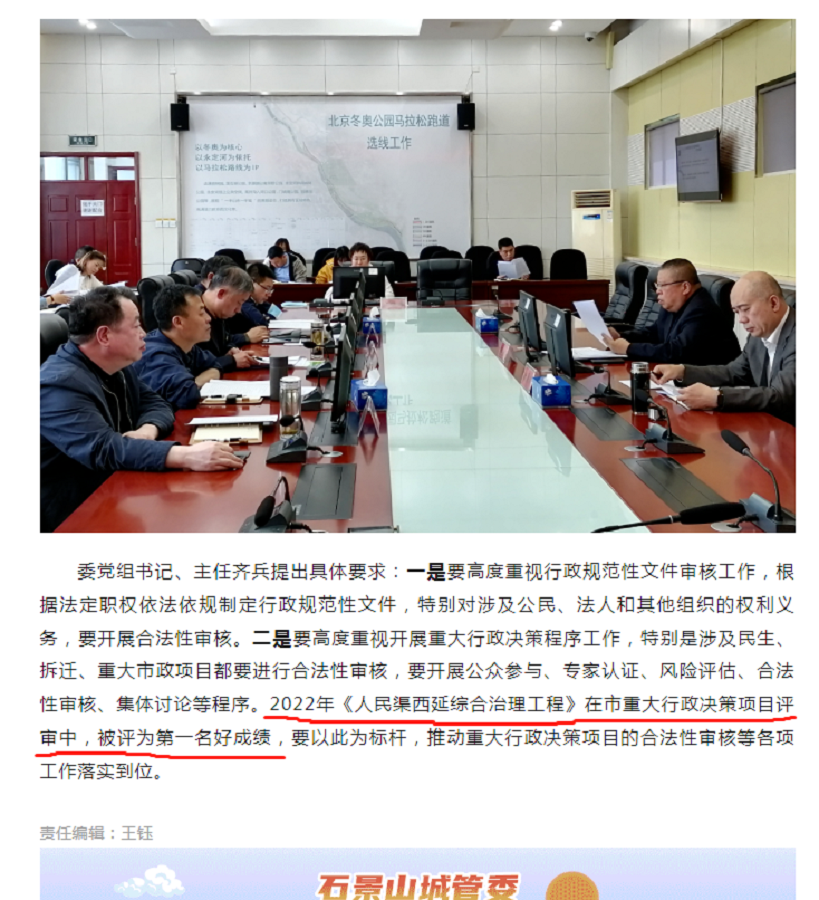 近日,在市级重大行政决策项目评审中,由石景山区城市管理委员会负责实施的人民渠西延工程项目,最终在市级评审结果中取得第一名的好成绩,并被立为重大决策事项标杆项目。