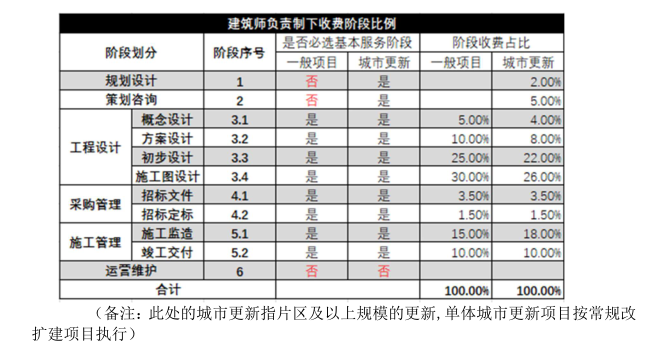 按照建筑师负责制模式下项目全生命周期的阶段划分,基于“施工阶段服务及收费占比约 25%”的国际通行实践,反映建筑师负责制在施工技术管理阶段相较传统模式下的工作增量,建议必选基本服务阶段及各阶段必选服务成本计算比例如下表。