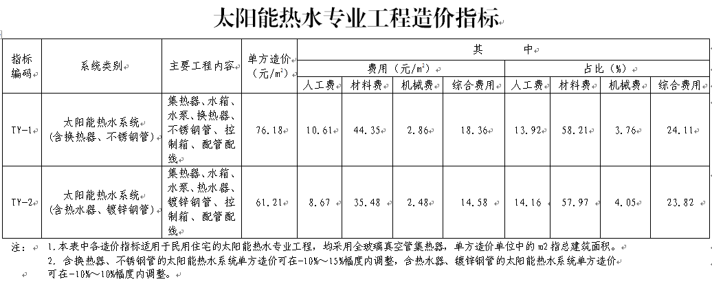一、《太阳能热水专业工程造价指标(修订稿)》(以下简称本指标)主要适用于民用住宅的太阳能热水专业工程,可作为投资控制和工程招标时确定专业工程暂估价的参考。