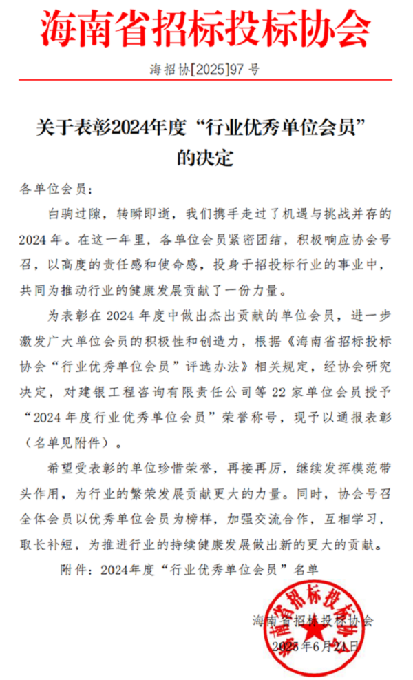 热烈祝贺爱体育首页荣获海南省招标投标协会2024年度行业优秀单位会员荣誉称号